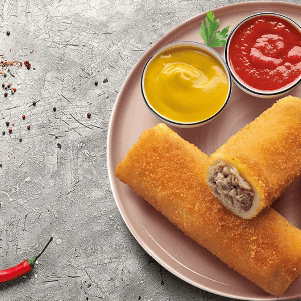 Panierte Teigrollen, gefüllt mit Fleisch