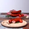 Zutaten: Schweinefleisch (94%), Trinkwasser, Speisesalz, Gewürze, Knoblauch, Traubenzucker, Antioxidationsmittel: Ascorbinsäure, Stabilisator: Diphosphat, Mononatriumcitrat, Konservierungsstoff: Natriumnitrit, Buchenholzrauch