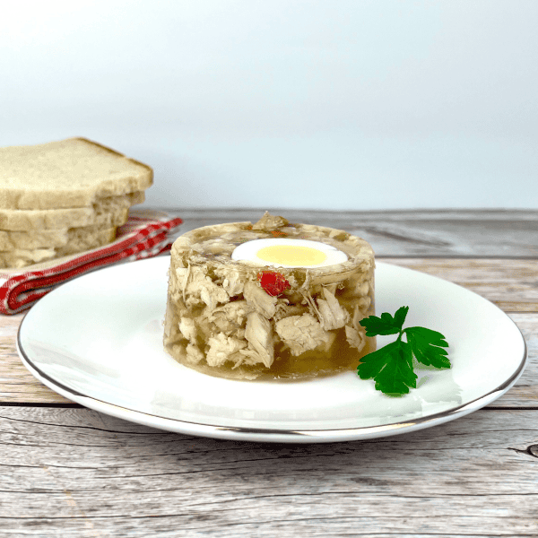 Bestelle jetzt unsere Sülze mit Hühnerfleisch und genieße ein Stück kulinarische Handwerkskunst, das geschmacklich und optisch begeistert. Perfekt für alle, die auf der Suche nach einer leichten, aber geschmacksintensiven Option sind!