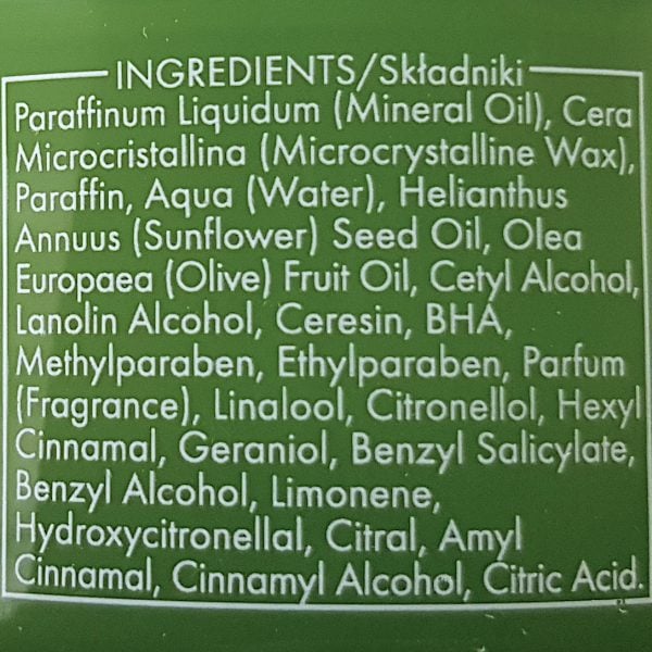 Zutaten: Paraffinum Liquidum (Mineralöl), Cera Microcristallina (mikrokristallines Wachs), Aqua (Wasser), Helianthus Annuus (Sonnenblumen) Samenöl, Olea Europaea (Oliven) Fruchtöl, Cetylalkohol, Lanolinalkohol, Tocopherylacetat, Ceresin, Methylparaben, Parfum ( Duft), Citronellol, Geraniol, Hexylzimt, Linalool, Benzylalkohol, Hydroxycitronellal, Limonen, Amylzimt, Cinnamylalkohol, Citral, Zitronensäure - pH-hautneutral Dermatologisch getestet. Haltbarkeitsdatum befindet sich unten.