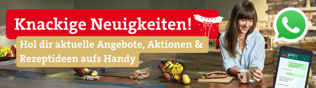 Schnapp dir die neuesten Angebote und lass dich von kreativen Rezeptideen inspirieren – all das wartet im golly’s WhatsApp Newsletter auf dich. Verpasse keine Highlights und Sparangebote, die jeden deiner Einkäufe zum Vergnügen machen. Abonniere golly’s WhatsApp-Updates, um deinen Einkauf ganz einfach zu planen, ob für die Grillzeit, Festlichkeiten oder deinen Alltag. Unsere regelmäßigen Nachrichten halten dich nicht nur über die besten Deals auf dem Laufenden, sondern bieten dir auch innovative Rezeptideen, die deine Kochkünste verfeinern. Spare clever und genieße die polnischen Köstlichkeiten mit golly’s.